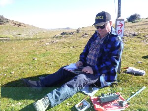 Ian took a rest in the Kings Throne at the trig point after our short hike to the top then it was on with setting up the antennas. We started on 80m to work the locals first and Ian qualified the summit on 80m ssb first up before UTC roll over then gave out some contacts on 40m ssb as well after roll over.