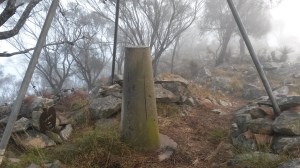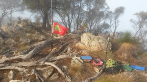 SOTA Flag flying nicely on the trig point. View of Mt Bryan to the north.