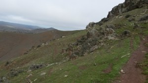 Some of the lower screed benched trail still at a reasonable height on the side of the mountain.
