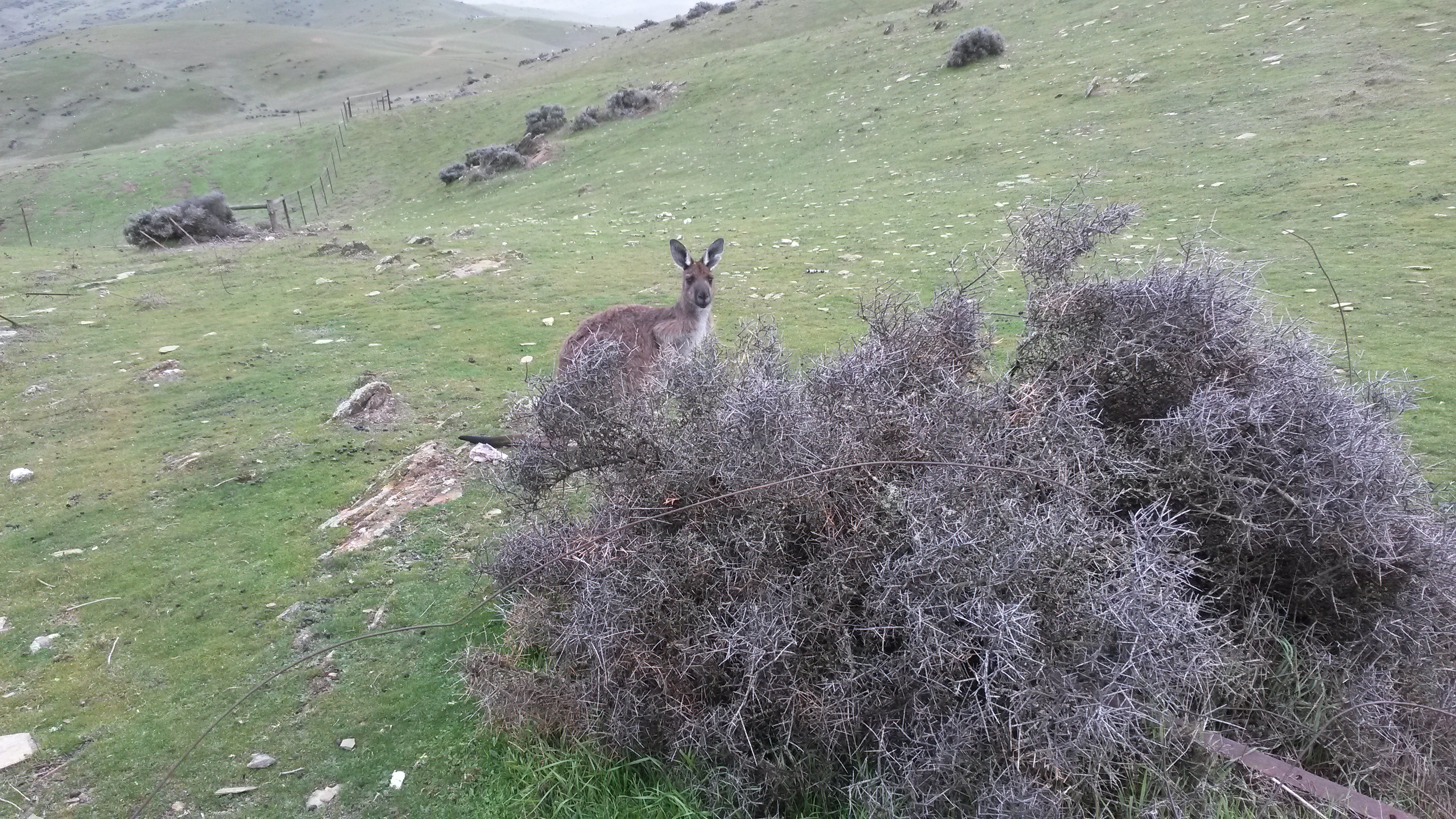 The Wind was kind today up here This old Roo was sleeping behind this bush.