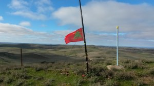 SOTA Flag flying nicely on the trig point. View of Mt Bryan to the north.