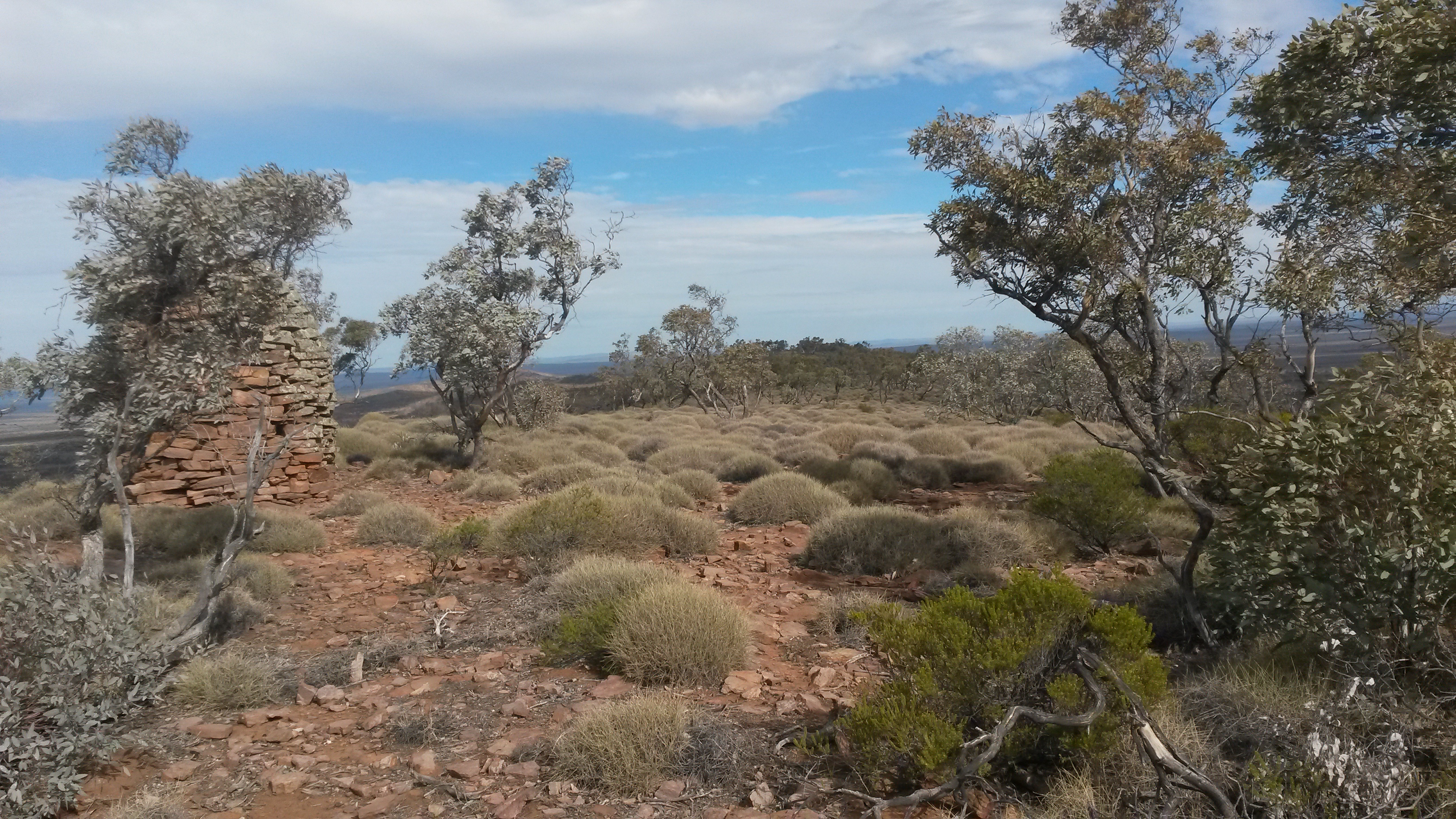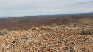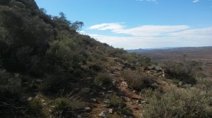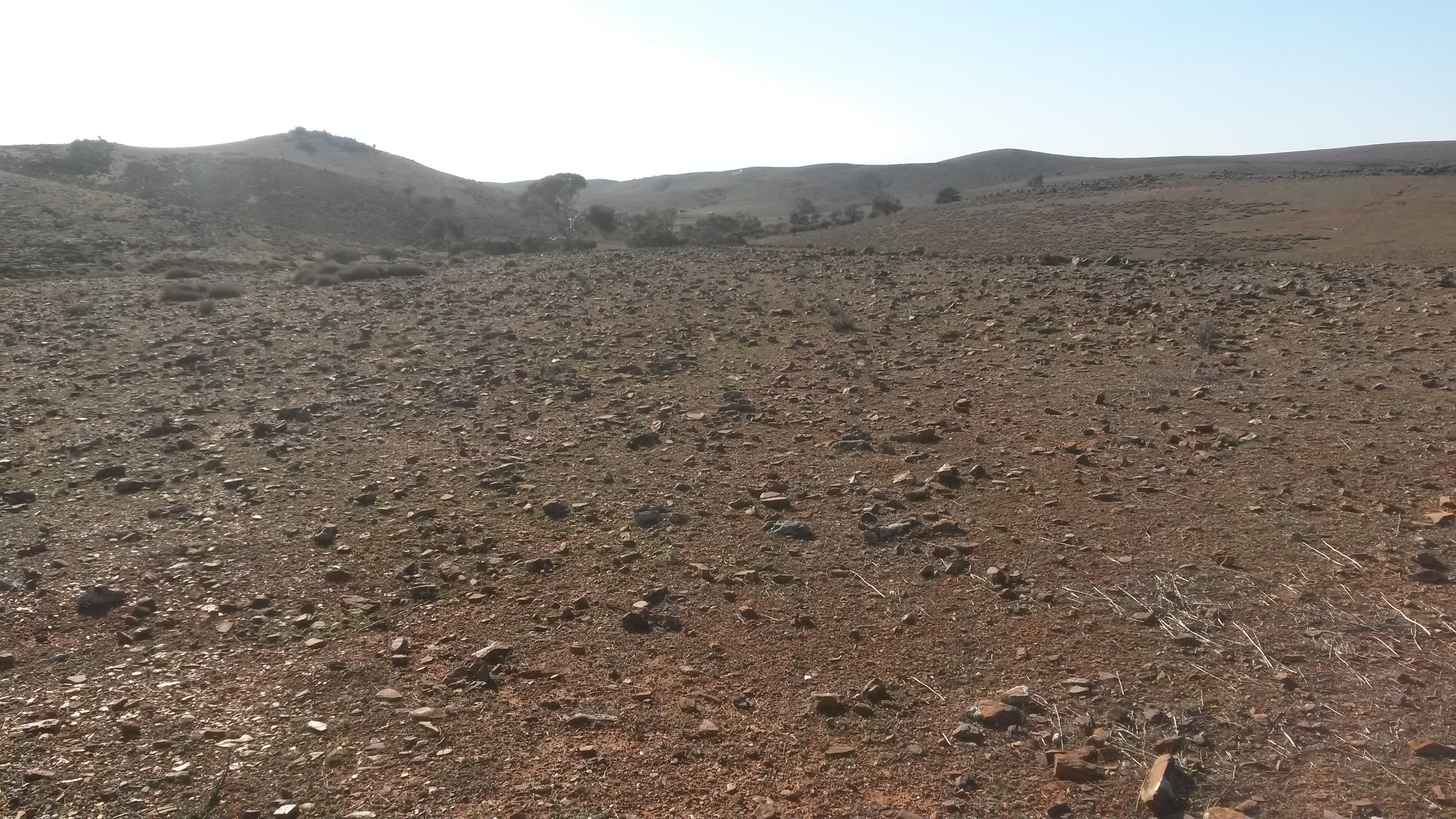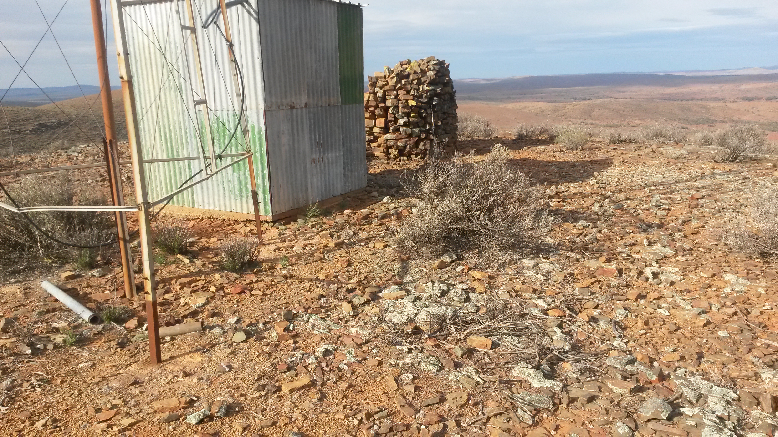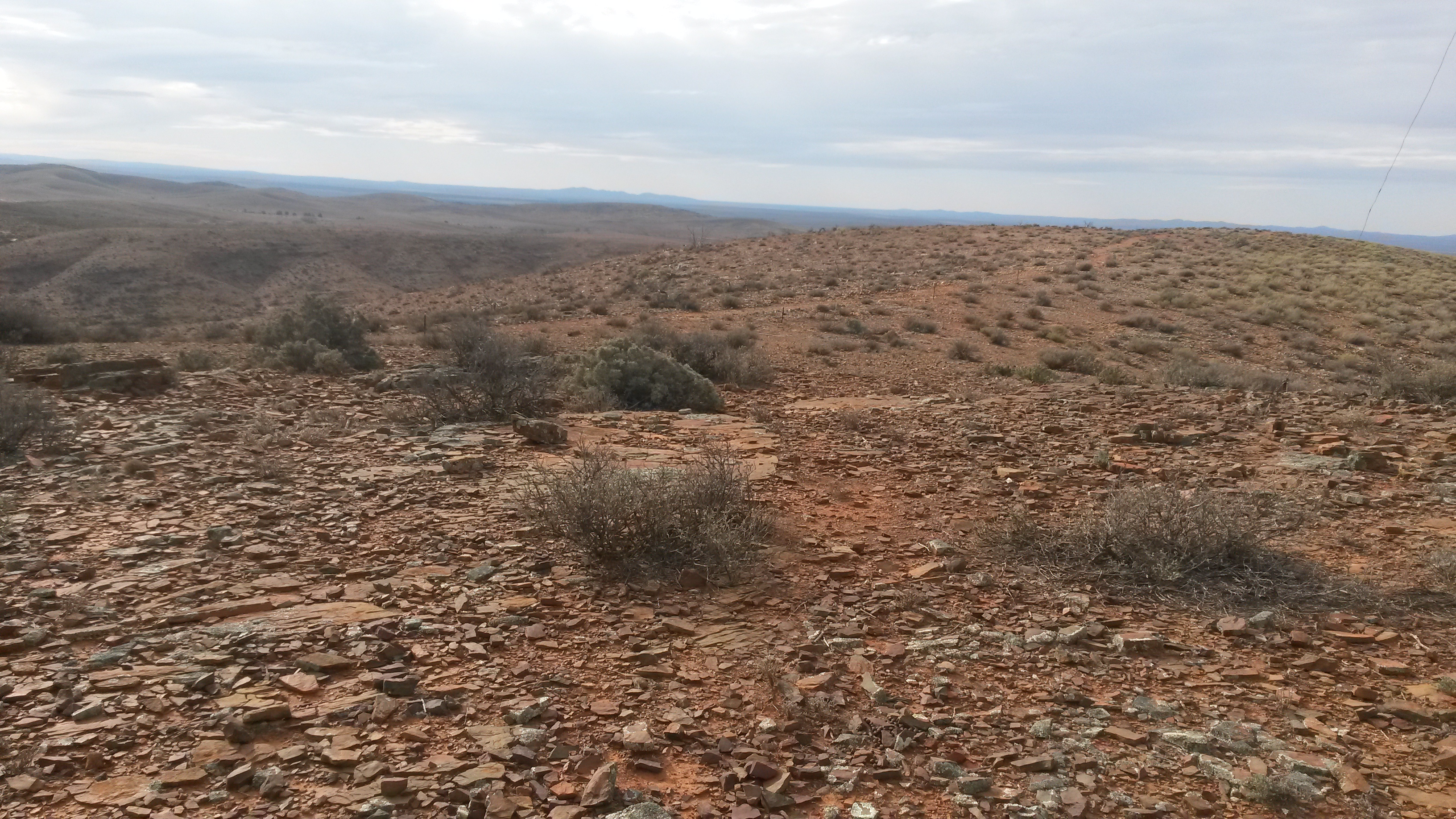 I headed out early for Price Hill vk5/ne-056 on Pamatta Station quite early about 5.00 am wanting to be north of Orroroo after daylight because of Kangaroos on the road. Had my porridge at 7.30 am about 40 km north of Orroroo with the 3.680 group sked using the mobile rig and Hustler antenna to report my progress. Sometime later I left my vehicle parked at a windmill and tank at 9.00 am to start the hike to Price Hill which is about 3.5 km on the map but taking into account the gain of the hill it turns out to be 3.7 km following a couple way points I had saved in the E trex 30 to keep on track. Its a rocky climb and mostly Spinifex Grass as the only ground cover. There must have been some rain because I noticed a small pool of water in the creek I walked along to start out.