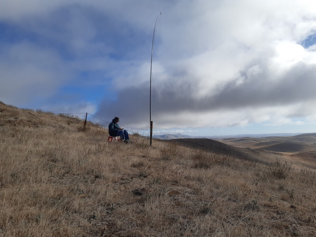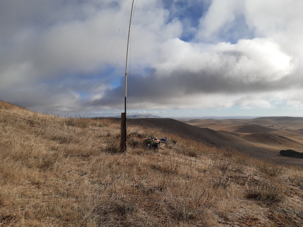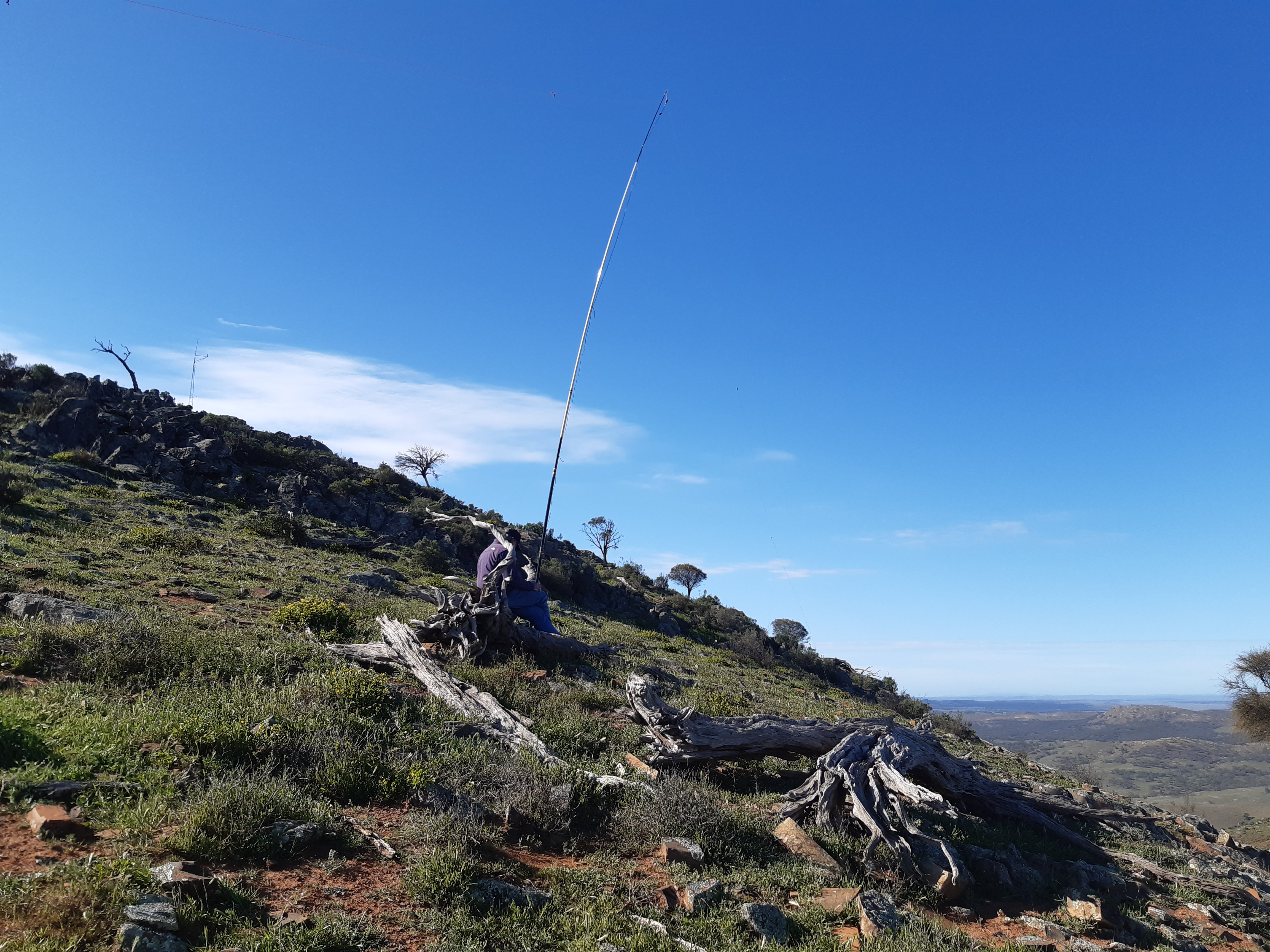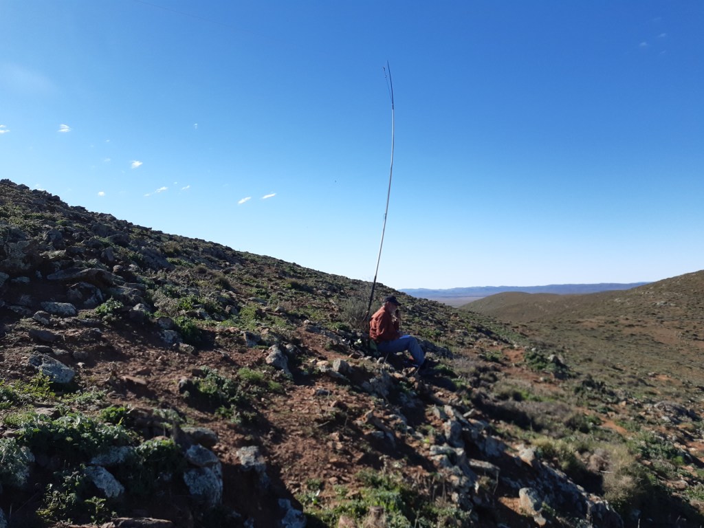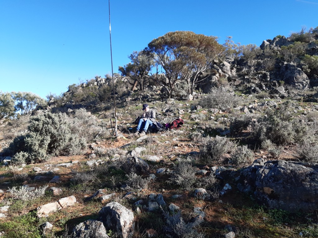 The wind was very strong on this afternoon summit so we only put the Squid pole up 6 metres and leaned it into the wind to keep it up. The bush we used to tie to is broken down by hungry goats so is no longer a viable support therefor we bungeed the pole around the rock shelf and packed extra rocks for support. No shortage of rocks up here.