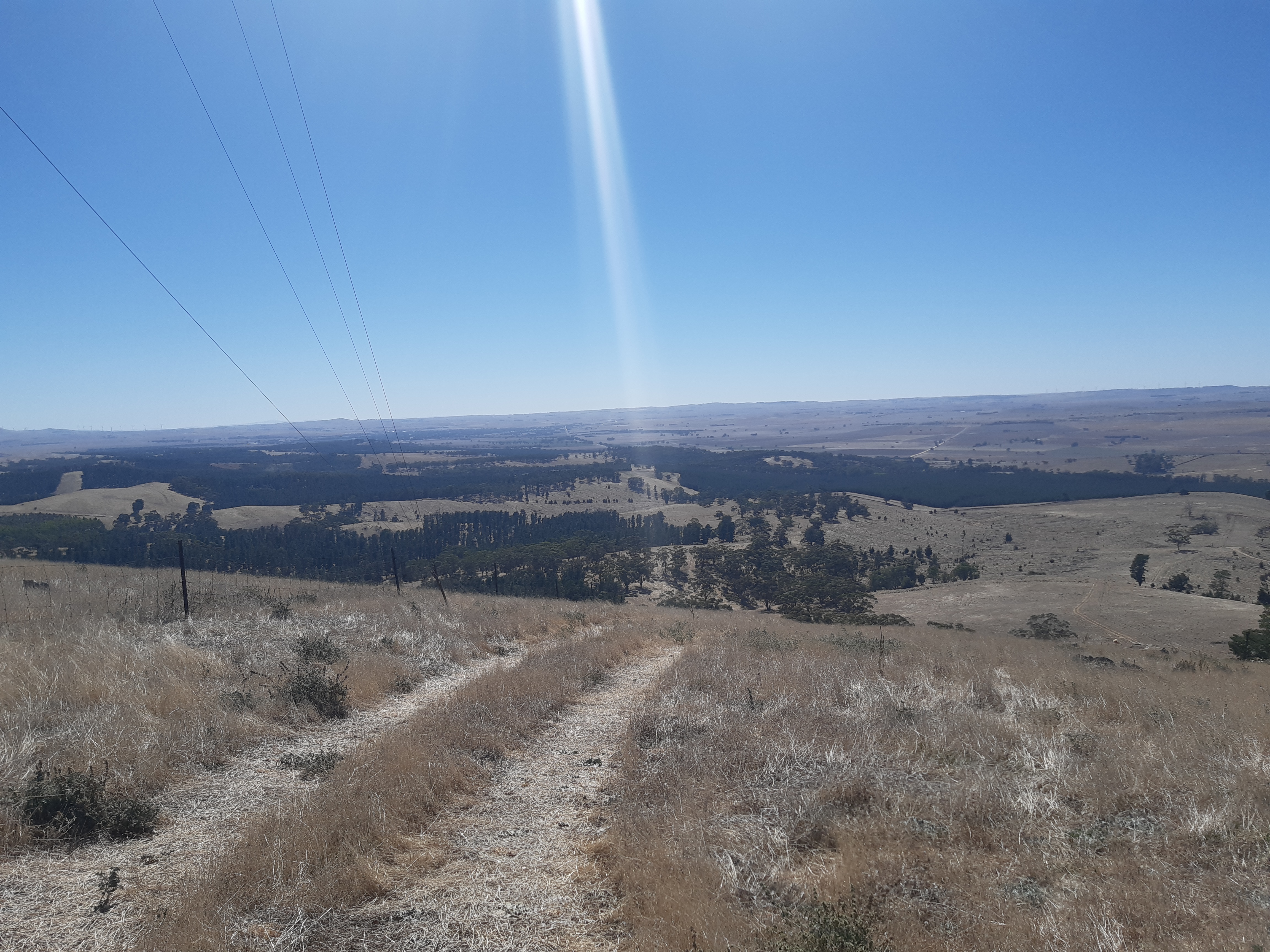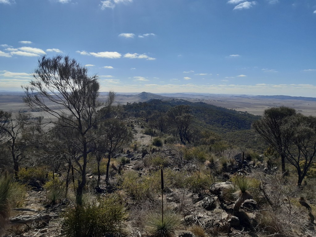 Looking out east at what remains of the forest the burnt out area is now privately owned as grazing land for sheep. We are lucky the farmer still grants access to the summit at this stage.