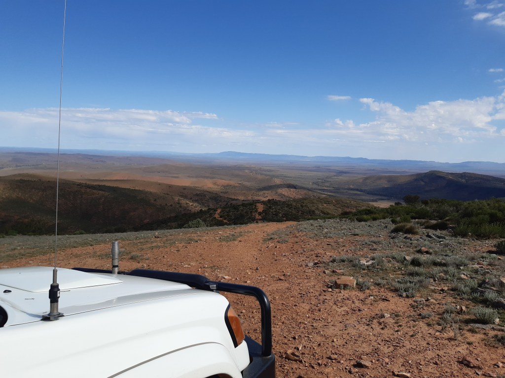 We had a quick lunch break back at Mitsi this time and headed about 30km north on station tracks to the next summit. This summit is a 1 km hike up but Hugh wanted to try a different way to get there which was a bit difficult because a lot of the lower track was washed away. But with some walking out and some shovel work we got around the wash outs and made a 4×4 climb to the top instead. Mitsi handled it with ease in low range and we got on with the activation.