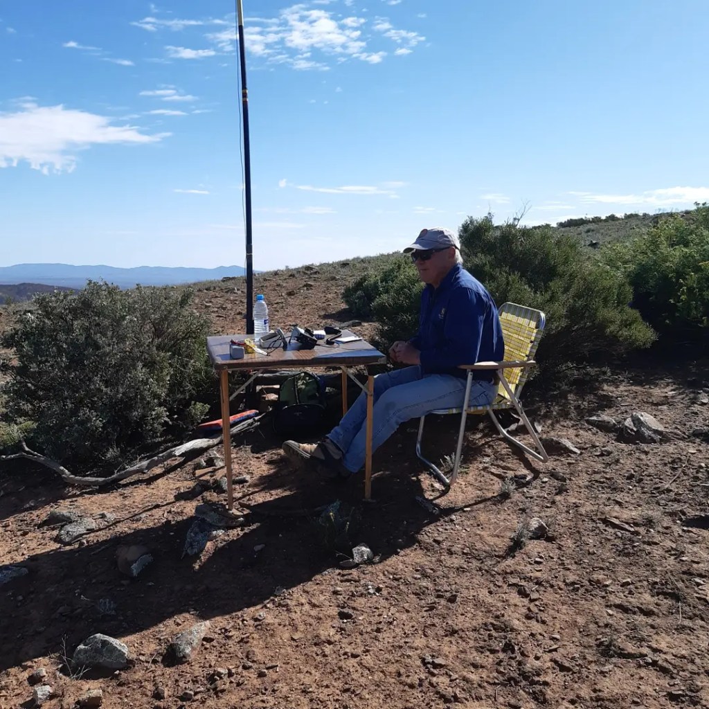 Hugh operating on Mt Nadguri behind this Box Thorn bush trying to get out of the freezing wind. This time we used my End Fed Half Wave for 40m and was able to set it up between the two bushes.